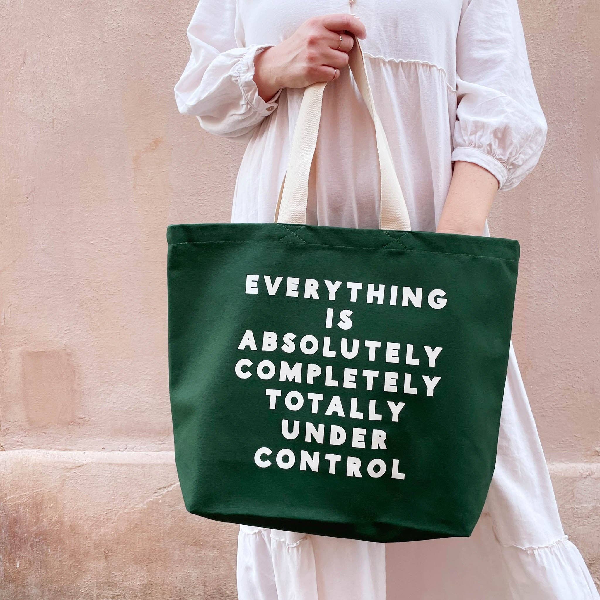 Our hand illustrated 'Everything is absolutely, completely, totally under control' design has been printed in off-white on sturdy forest green canvas. Suitable for carrying by hand or over the shoulder.