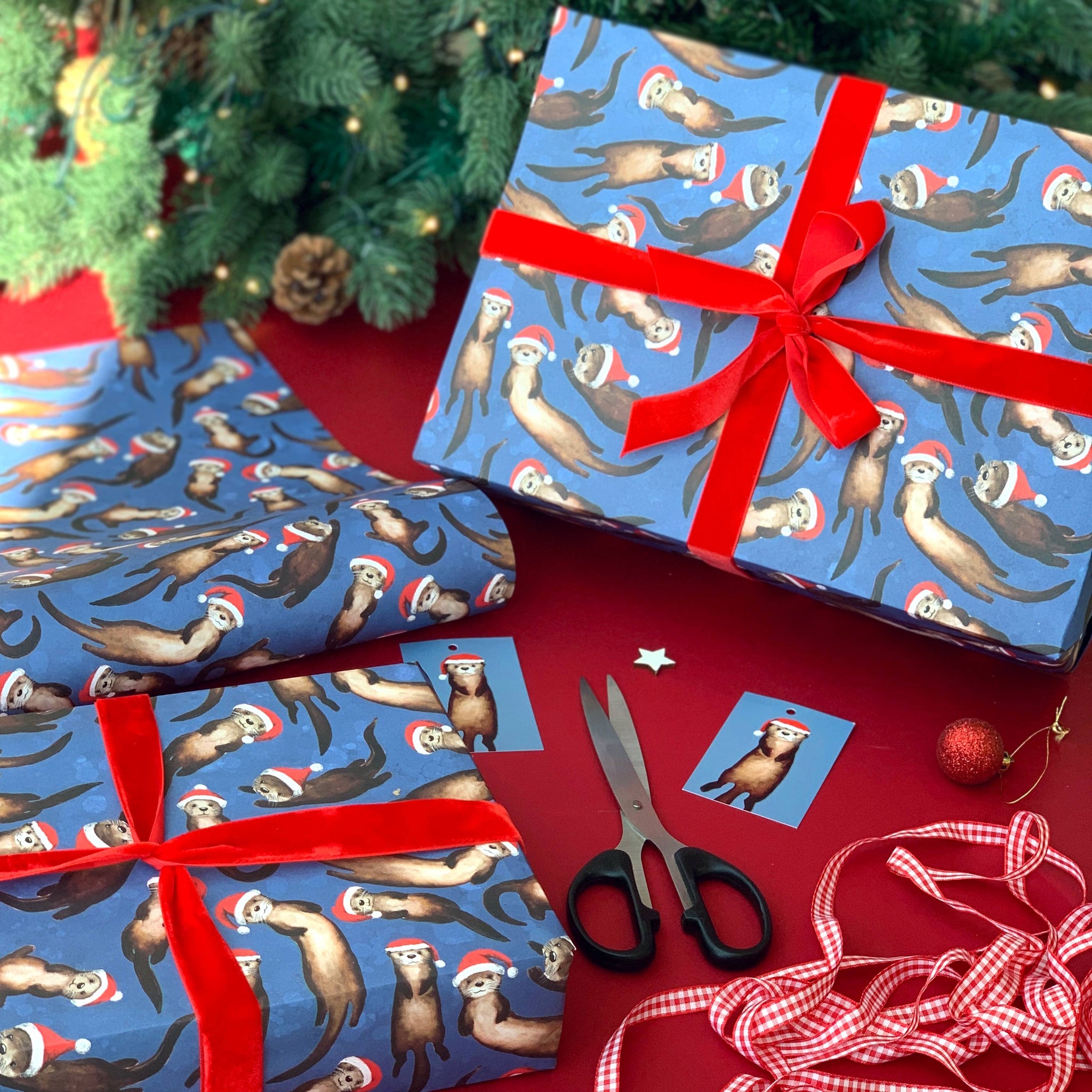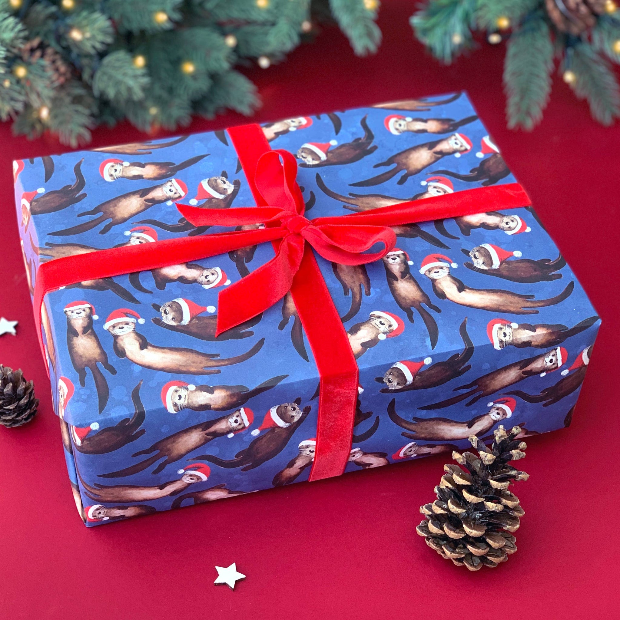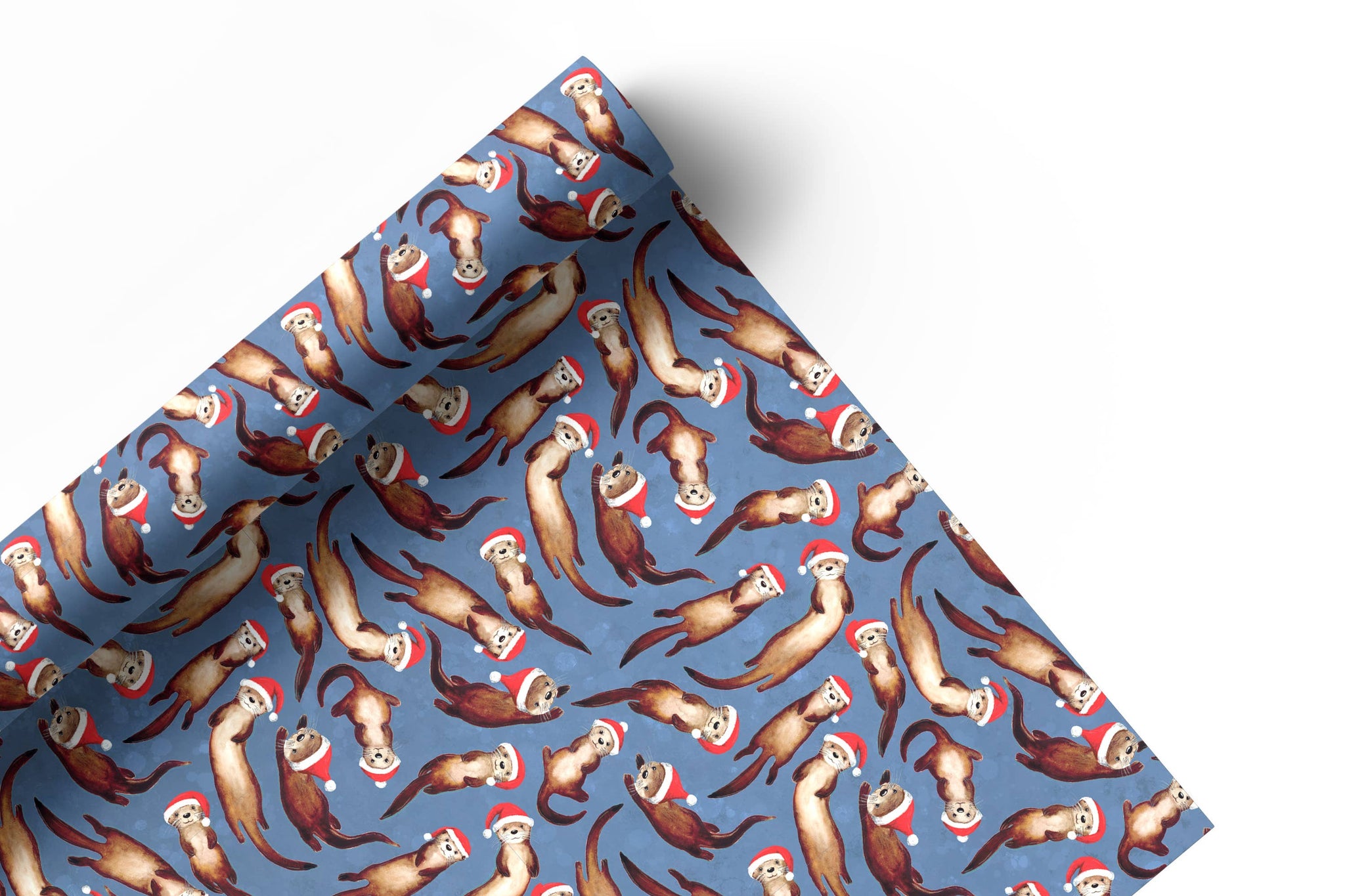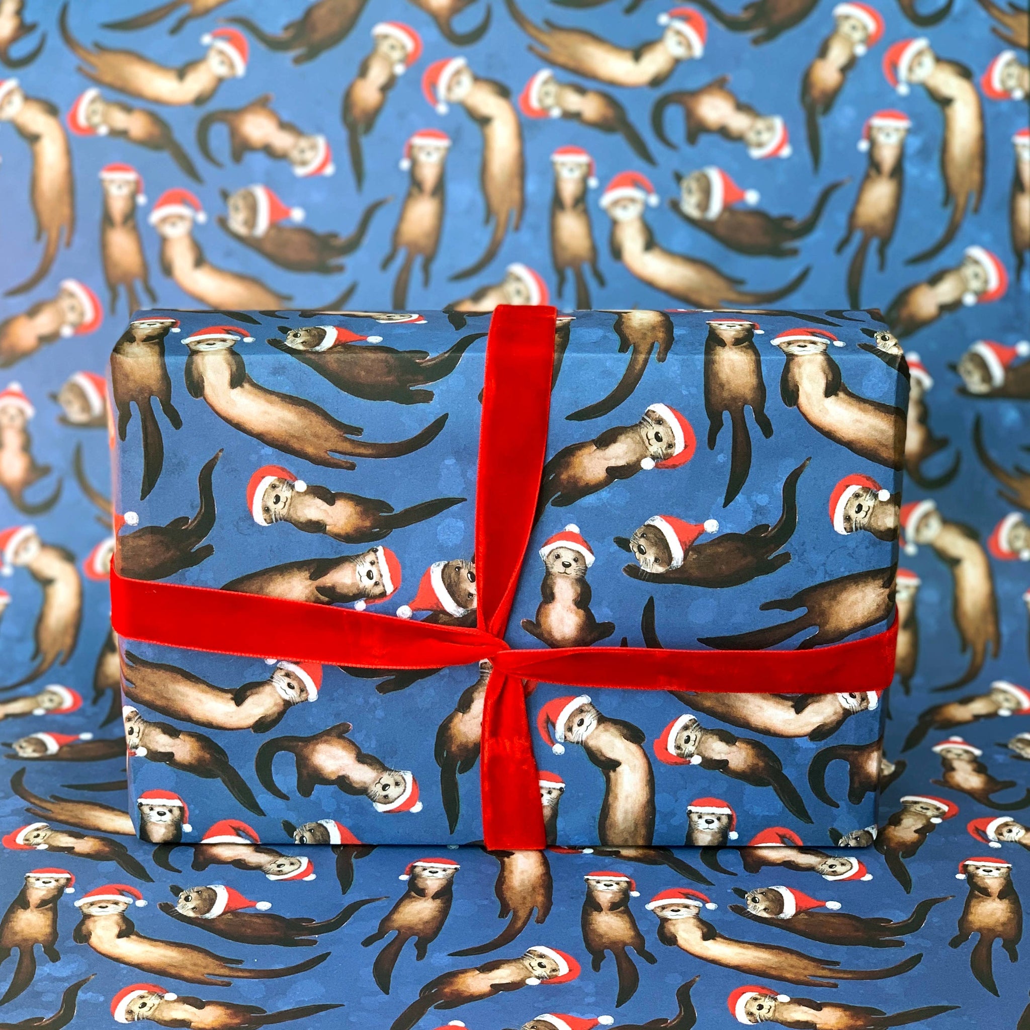 Watercolour Christmas otters illustrated wrapping paper. Printed on thick, matte paper stock. Fully recyclable. Designed by Alexia Claire in her National Forest studio.