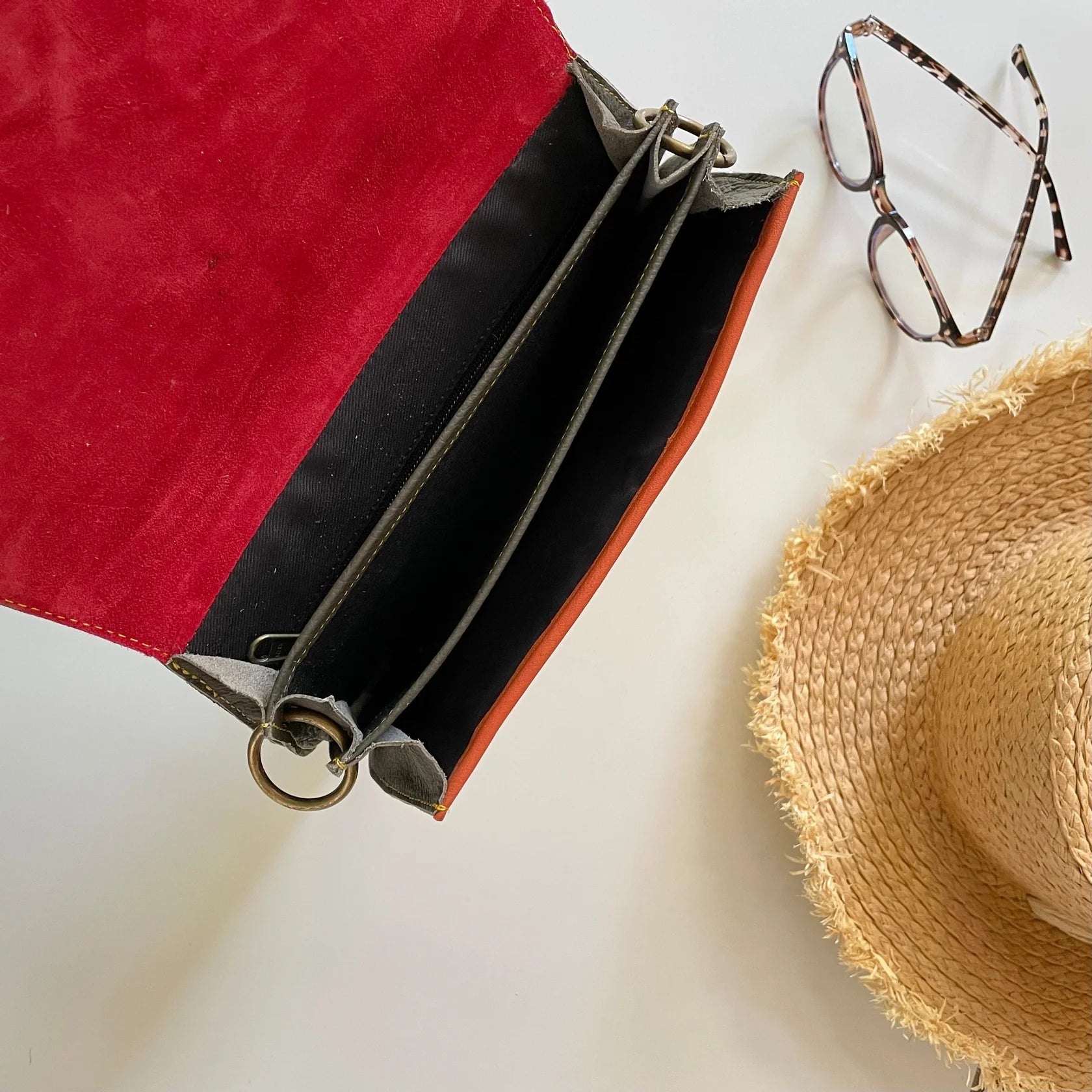 Alice measures approx 25cm x 21cm. It has a long extendable shoulder strap, compartments and internal zip and is made from upcycled leather.