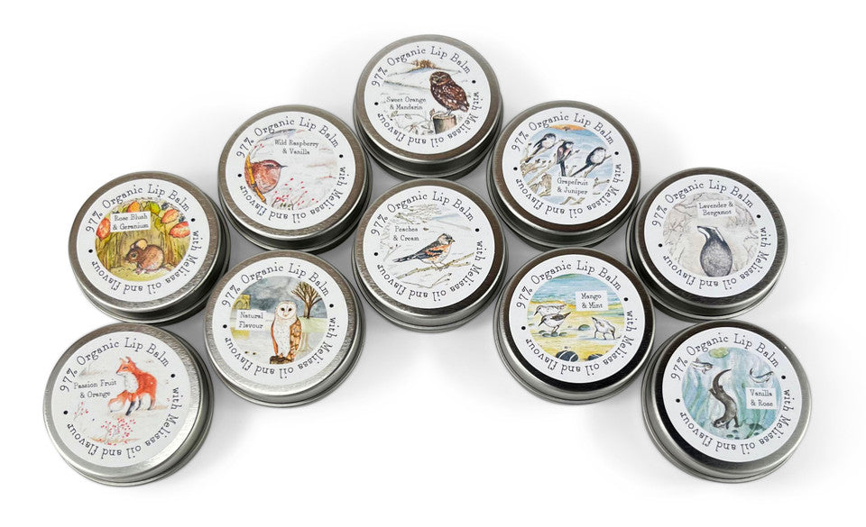 We have a choice of 9 flavours and 1 unflavoured lip balm to choose from, each represented with a beautiful illustration by Sarah Pettitt.
