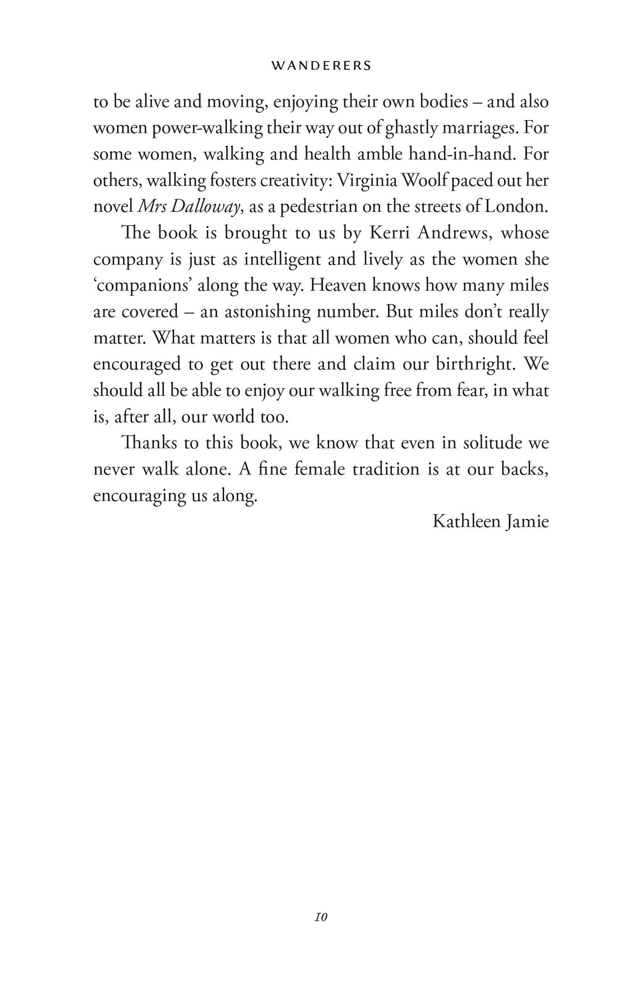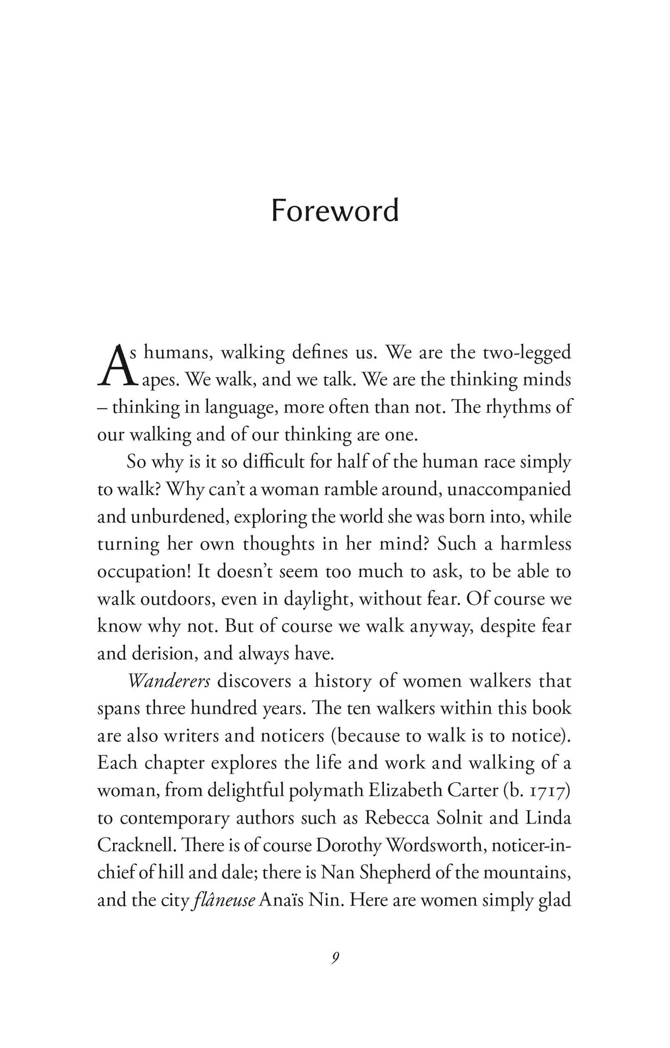 In a series of intimate, incisive portraits, Wanderers traces the footsteps of ten women, from eighteenth-century parson's daughter Elizabeth Carter - who desired nothing more than to be taken for a vagabond in the wilds of southern England - to modern walker-writers such as Nan Shepherd and Cheryl Strayed. For each, walking was essential to living, whether it was rambling for miles across the Scottish Highlands, like Sarah Stoddart Hazlitt, or pacing novels into being, as Virginia Woolf did around Bloomsbury.