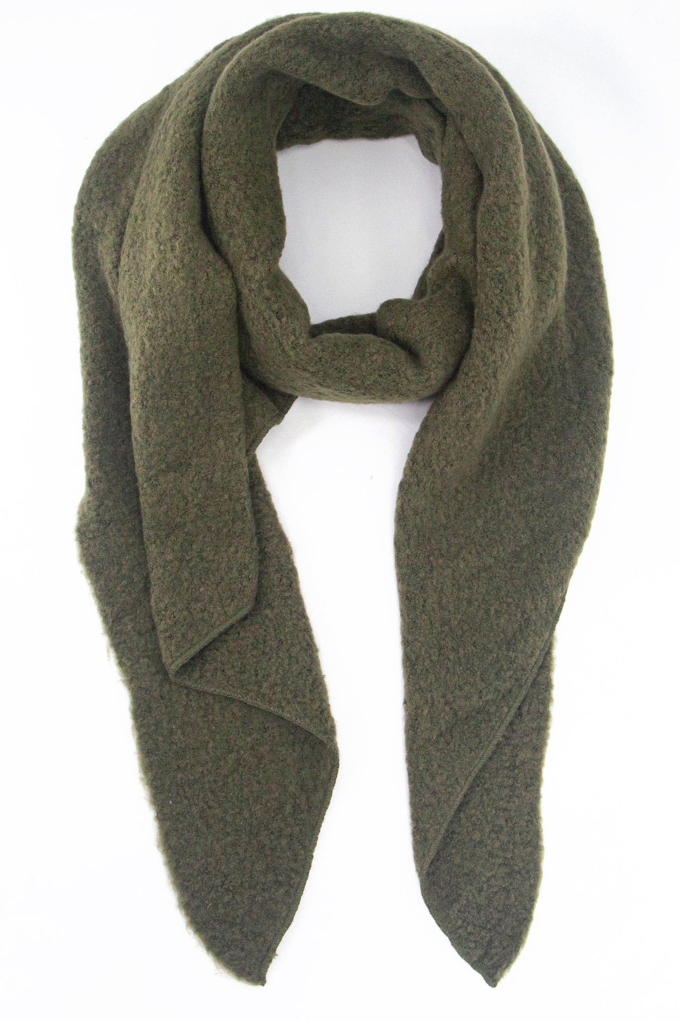 One of our classics in a new olive/khaki green colourway - I love the asymmetric scarves because the diagonal cut of the ends make it fall into such a lovely shape. Super soft and cosy, this is like being wrapped in a warm hug.