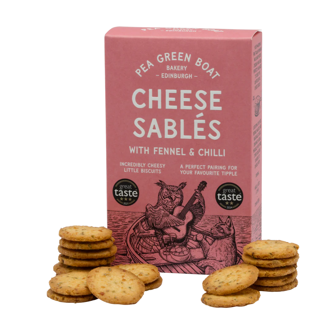 The Pea Green Boat Cheese Sablés are lovingly made using Italian parmesan, mature cheddar, butter and local organic flour, alongside the shortbread in our bakery.