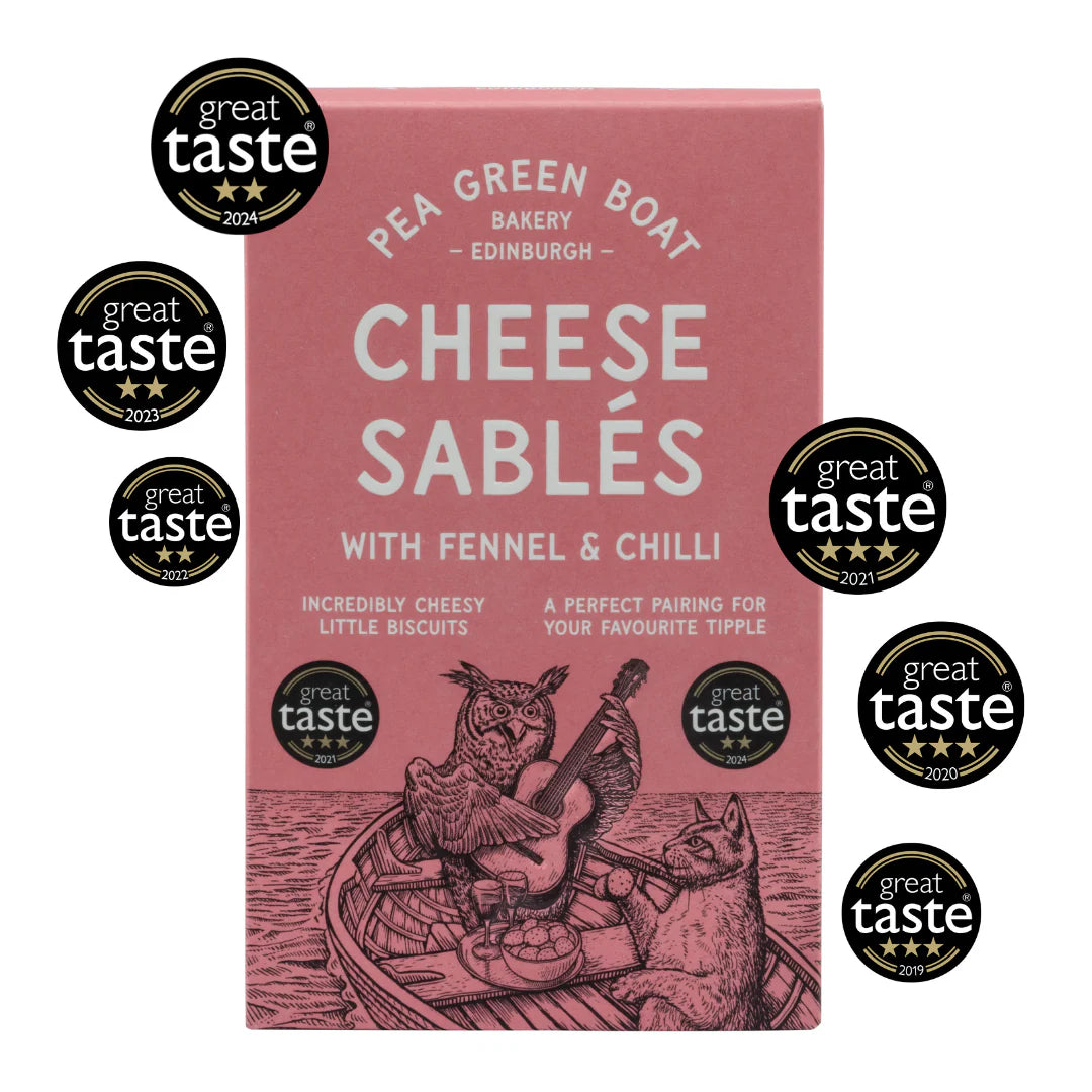 These Chilli & Fennel flavour sablés were awarded the Golden Fork from Scotland, in addition to 3-star Great Taste Awards in 2021, 2020 and 2019, and 2-star Great Taste Awards in 2024, 2023, and 2022, and 1-star Great Taste Award in 2025.