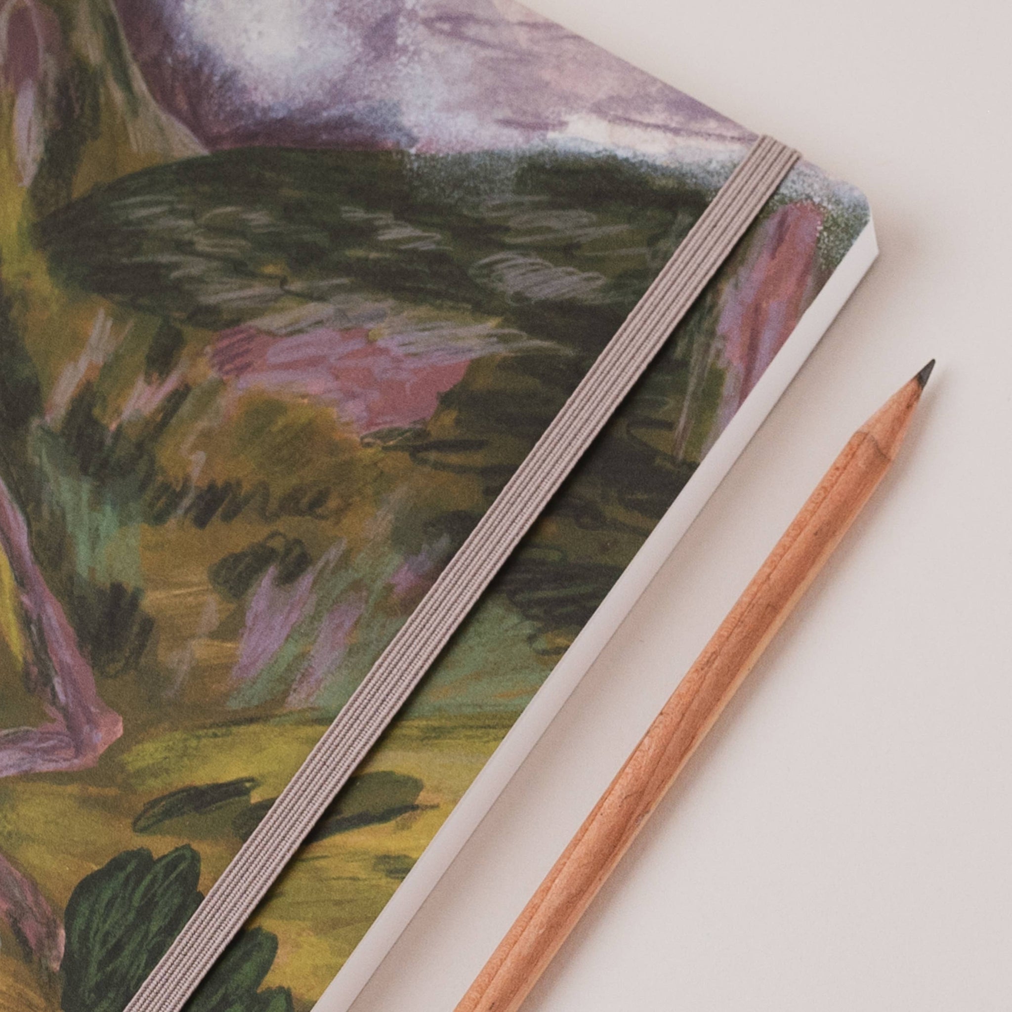 A beautiful luxury A5 notebook featuring a landscape mixed media illustration of Glencoe in Scotland on a moody late summer day.