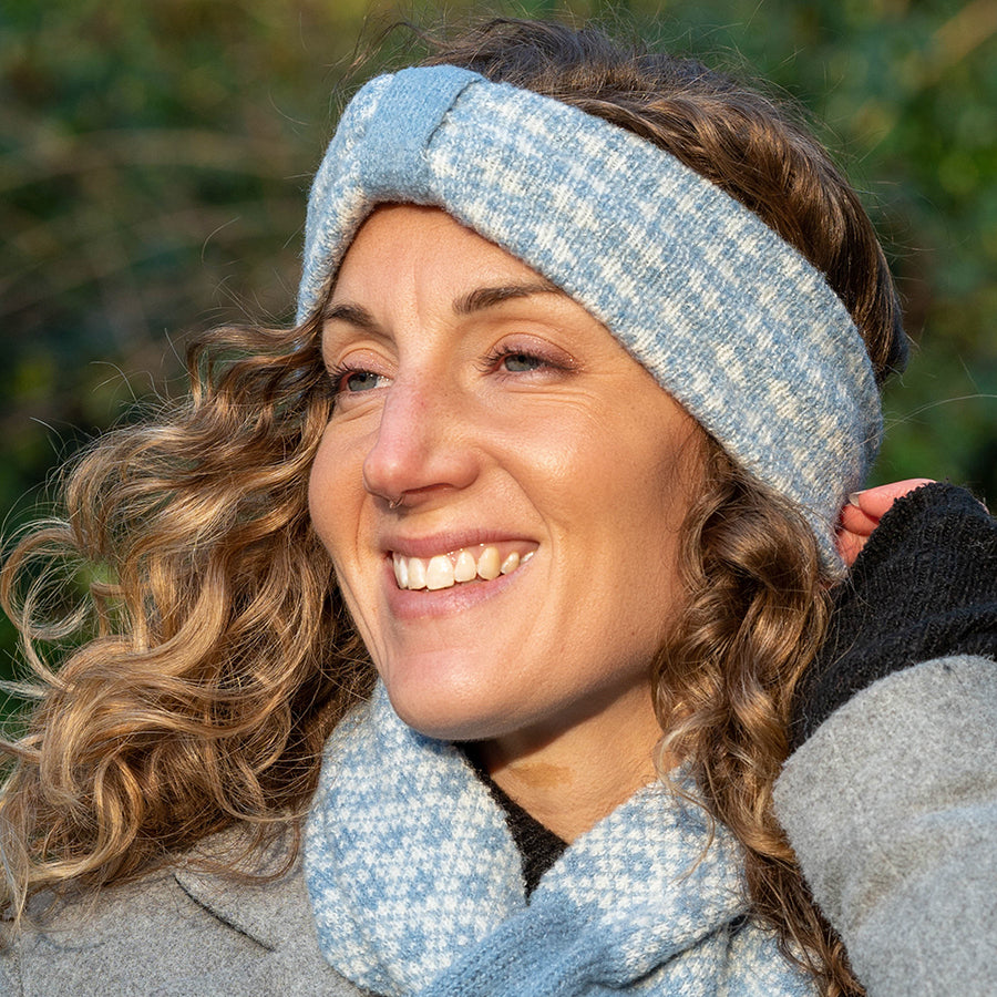 A recycled blend headband with blue and white floral details, the perfect winter accessory to keep you cosy this winter!