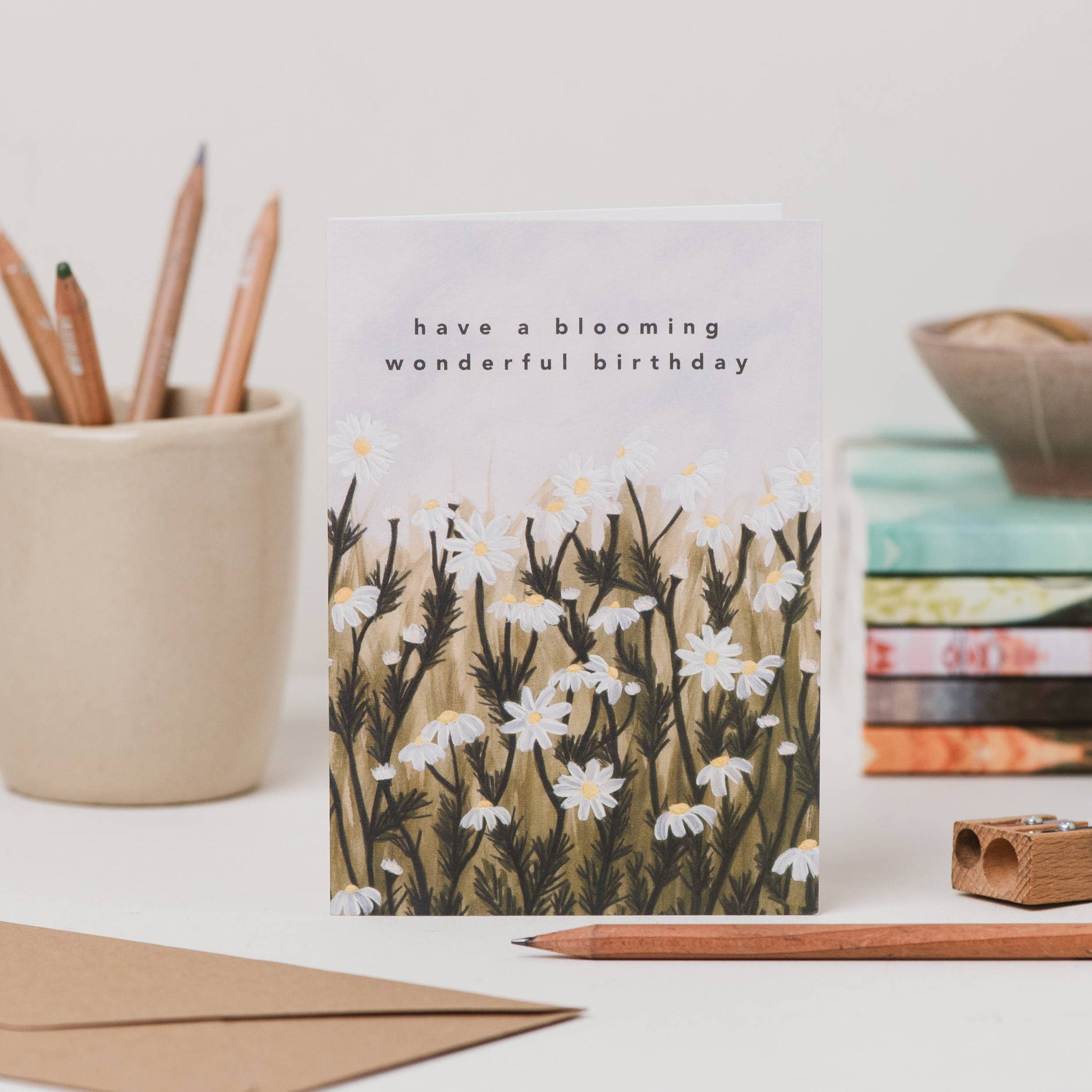 This luxury birthday card features the phrase 'have a blooming wonderful birthday' on an illustrated background of a field of daisies.