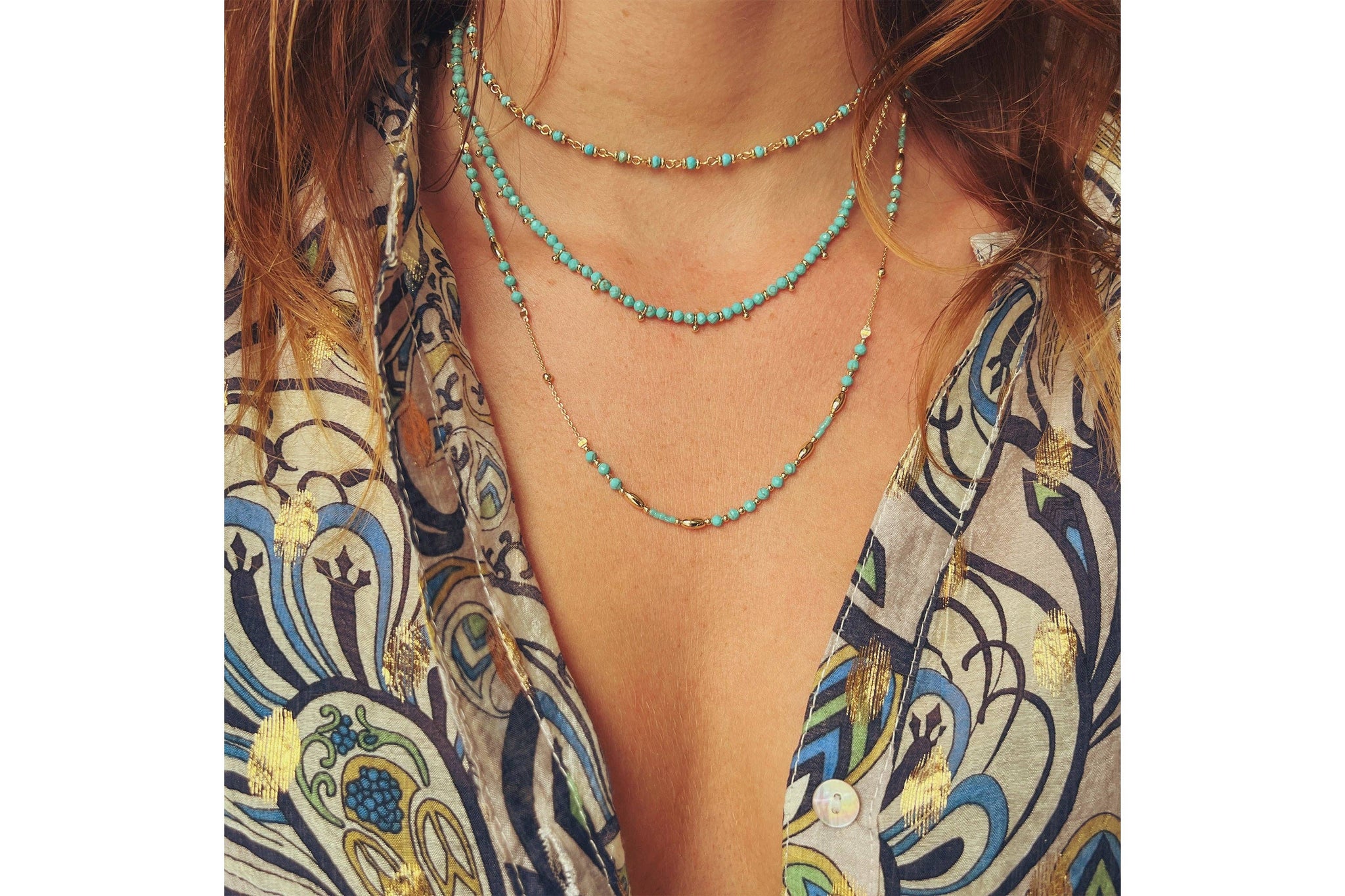 Add a touch of wellness to your look, through the power of gemstone necklaces. This beautiful necklace from Boho Betty includes turquoise coloured gemstones. Known as the stone of protection, turquoise balances the body and encourages inner healing.