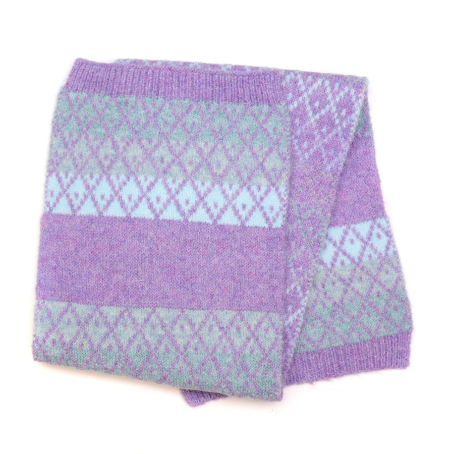 Recycled polyester and alpaca blend pull through scarf with lilac and blue diamond design.