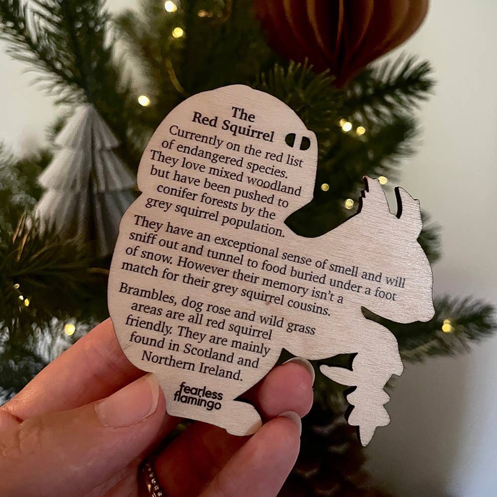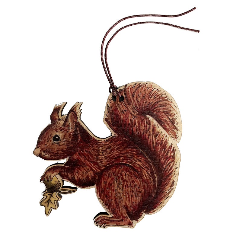 A beautifully illustrated Red Squirrel hanging decoration printed on sustainably sourced birch wood.